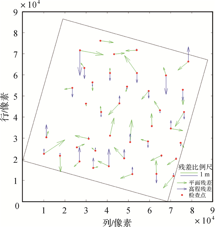 | 图 3 在轨标定后检查点在平面、高程方向上的残差分布 Fig. 3 Residual distribution of check points in plane and elevation after orbit calibration |