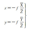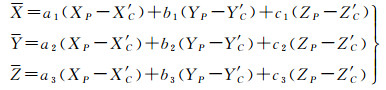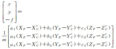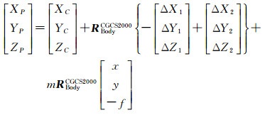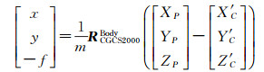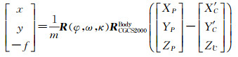式中,x=Ffsin θf、y=Fbsin θb,f=Ffcos θf、Fbcosθb,θf和θb分别为前视、后视相机倾角,Ff和Fb分别为前视、后视相机焦距;(XP, YP, ZP)和(XC, YC, ZC)分别为地面点P和卫星质心C在CGCS2000坐标系下的坐标;m为比例因子;(ΔX1, ΔY1, ΔZ1)和(ΔX2, ΔY2, ΔZ2)分别为卫星质心和相机投影中心在卫星本体坐标系下的坐标。