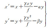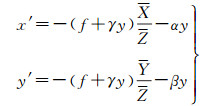 式中,x′、y′为修正后像点坐标;α为线阵绕Z轴的旋转角;γ为线阵绕X轴的旋转角;β为线阵绕X轴、Z轴旋转对像点坐标y的影响因子。将式(8)代入式(9)有