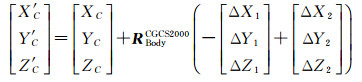 2 在轨几何标定严密成像模型 2.1 双线阵相机等效变换高分十四号卫星双线阵相机在轨几何标定使用的姿轨数据是通过精密定姿、精密定轨处理后的数据,通过精密定姿得到的是卫星本体坐标系到CGCS2000坐标系的旋转矩阵RBodyCGCS2000,通过精密定轨(动力法模型)得到的是卫星质心在CGCS2000坐标系下的坐标[25]。