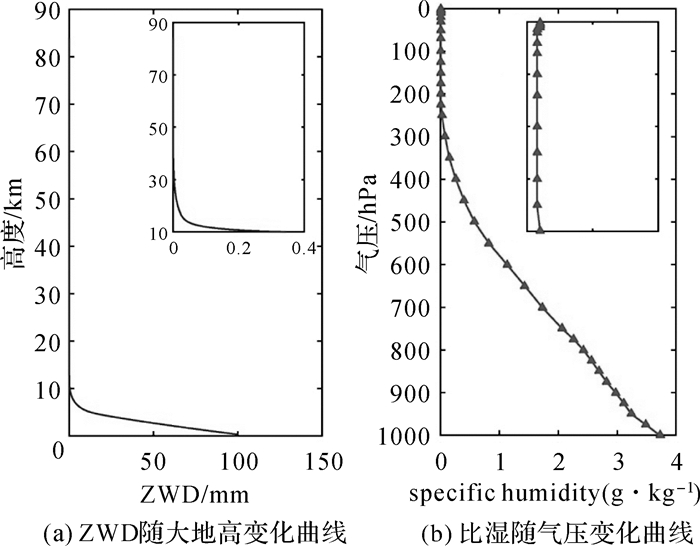 | 图 1 ZWD随高度和比湿随气压的变化曲线 Fig. 1 Changing curves of ZWD with height and specific humidity with pressure |