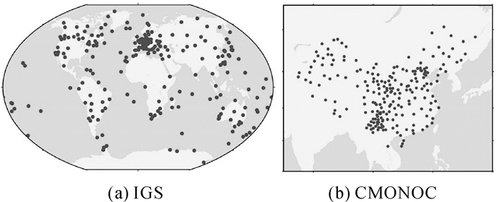 | 图 2 IGS和CMONOC站点分布 Fig. 2 Distribution of selected IGS and CMONOC stations |