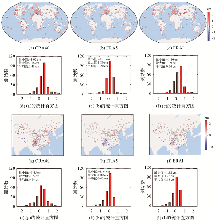 在中国区域,ERA5 ZTD Bias仍然最小,均值为0.02 cm(图 3(h)、(k))。ERAI ZTD Bias次之,均值为0.11 cm(图 3(i)、(l))。CRA40 ZTD Bias同样最大,平均为0.28 cm,川滇地区、新疆北部的ZTD正偏差较为明显,负偏差则主要出现在新疆南部区域(图 3(g)、(j))。再分析ZTD整体偏差均为正,表明再分析ZTD与GNSS ZTD间可能存在系统性偏差(再分析ZTD数值偏大),文献[42—43]也给出了类似的结果。