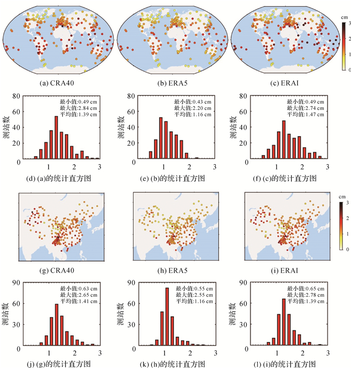 除了平均偏差外,图 4也相应地给出了基于3种再分析资料计算的ZTD RMS地理分布和直方图,图 4(a)、(b)和(c)分别给出全球范围CRA40、ERA5和ERAI的ZTD RMS分布,图 4(d)、(e)和(f)分别给出相应的统计直方图,图 4(g)、(h)和(i)分别给出中国区域CRA40、ERA5和ERAI的ZTD RMS分布,而图 4(j)、(k)和(l)则给出相应的统计直方图。在全球范围,再分析ZTD RMS与测站纬度相关,赤道及其附近区域RMS明显偏大,这主要是受赤道及其附近区域含量丰富且变化剧烈水汽的影响[44]。ERA5 ZTD RMS整体最小,平均为1.16 cm(图 4(b)、(e))。CRA40 ZTD RMS次之,平均为1.39 cm,其中赤道及其附近区域相比ERA5 RMS明显更大(图 4(a)、(d))。ERAI ZTD RMS整体最大,平均为1.47 cm,RMS较大的测站主要分布在赤道及其附近区域以及中东、中亚等地区(图 4(c)、(f))。