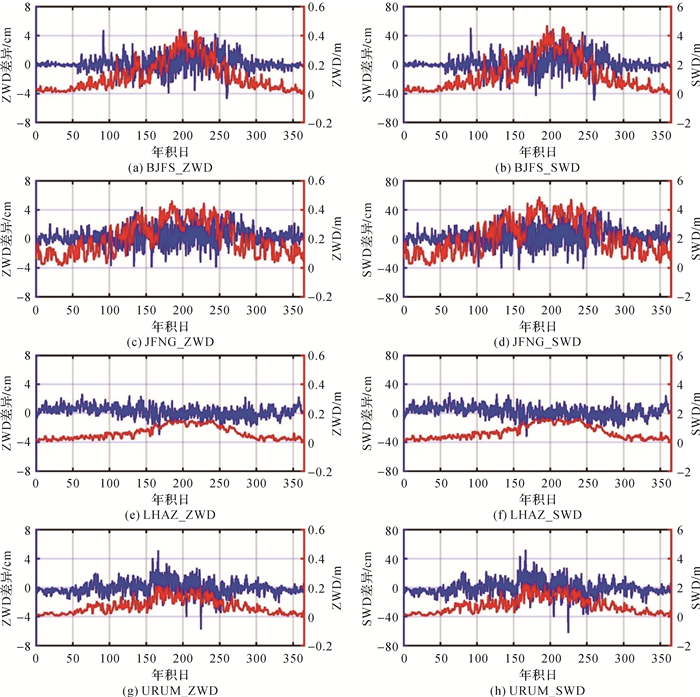 4 中国区域CRA40对流层湿延迟精度变化特征在中国区域CRA40对流层总延迟(ZTD和STD)精度主要取决于湿延迟部分(ZWD和SWD)计算精度,因此重点对中国区域CRA40湿延迟精度的变化特征进行分析。从中国区域选取4个代表性IGS测站,即BJFS(北京房山,温带季风气候)、JFNG(武汉九峰,亚热带季风气候)、LHAZ(拉萨,高原山地气候)和URUM(乌鲁木齐,温带大陆性气候),来分析2018年CRA40 ZWD和SWD精度变化特征,结果如图 5所示。图 5中,横轴表示年积日,纵轴(左,蓝色)表示ZWD/SWD差值,蓝色曲线表示CRA40 ZWD/SWD同ERA5 ZWD/SWD的差值时序,纵轴(右,红色)表示ZWD/SWD,红色曲线表示CRA40 ZWD/SWD时序。