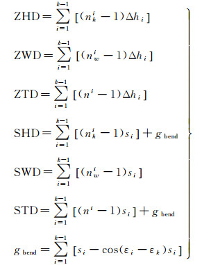 式中,ZHD为天顶静力学延迟(zenith hydrostatic delay); SHD为斜路径静力学延迟(slant hydrostatic delay); SWD为斜路径湿延迟(slant wet delay); STD为斜路径总延迟(slant total delay);ZHD、ZWD和ZTD统称为ZPD,SHD、SWD和STD统称为SPD;k为高度层层数;nhi、nwi和ni表示第i层和第i+1层的静力学折射率、湿折射率和总折射率均值;Δhi表示第i层和第i+1层的高差;si表示夹在第i层和第i+1层间的射线路径长度;gbend表示几何弯曲项;εi表示第i层处射线路径的高度角;εk为第k层(射线穿出层)射线路径的高度角。