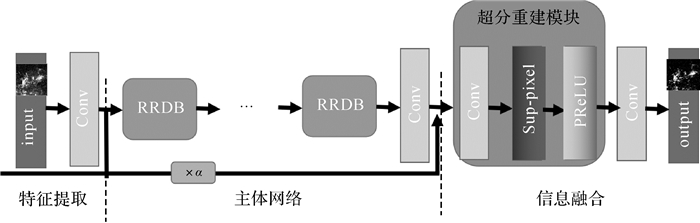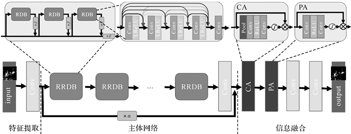 在去辉光、云雾网络中,整个网络分为特征提取、主体网络、信息融合3个部分,网络结构如图 14所示。云雾特征的提取部分利用卷积层实现,首先,用3×3×64大小的卷积提取周围像素的特征信息。然后,主体部分由残差密连模块(residual-in-residual dense block,RRDB)实现。RRDB将残差块(residual block,RB)和密度块(dense block,DB)结合起来,形成了残差密集块(residual dense block,RDB),再将3个RDB进行跨层连接,残差连接部分乘以缩放值β。RDB在端到端的多层连接中自然的集成了更多的低、中、高层次特征和分类器,并具有更强大的特征提取和映射能力。为了避免CNN网络的退化和梯度消失/爆炸问题,在深层CNNs中将残差网络结构与密集网络结构结合来解决这些问题。在网络主体部分连接若干RRDB,并将特征提取层的特征乘以缩放值α,缩放后连接到网络结尾的信息融合部分,此处的α可以防止云雾信息过量引入。主体网络部分采用泄露修正线性单元(leaky ReLU[53-54])激活,用于增加网络的非线性;它对输入小于0部分的反应有所变化,减轻了激活函数ReLU的稀疏性。Leaky ReLU表示为