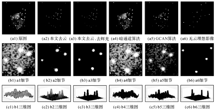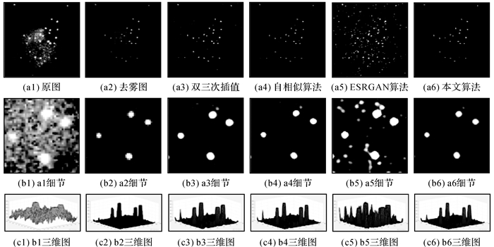 进一步对去除了云雾和辉光的影像进行超分辨率重建处理,处理结果如图 19所示。对比图 19(c1)—(c6)可以看出,图 19(c5)比(c2)柱状波峰多,对比原图可知这些信息是伪信息,图 19(c3)、(c4)比原图好,但没有图 19(c6)效果明显。