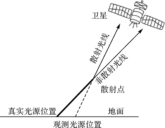 式中,D(x, y)表示下采样算子;B(x, y)表示模糊矩阵;M(x, y)表示几何运动矩阵。实际上夜光影像的主要降质表现为模糊,这些模糊主要是由于辉光和云雾影响产生的。辉光现象是指成像时大气中的粒子对光产生多散射作用,表现为影像中光源周围的模糊现象,如图 1(a)所示。辉光现象产生的原因是,人造光在穿过一些大气成分时,由于散射和吸收作用,部分光线向多方面改变传播方向,导致强度减小,卫星传感器沿着光传播的方向观察将其归因于一个错误的位置[41-42](图 2),表现在影像中为光源显著的时空变异性[43-44]、亮度值衰减。辉光现象在影像中普遍存在,有云雾的阴天该现象更明显。