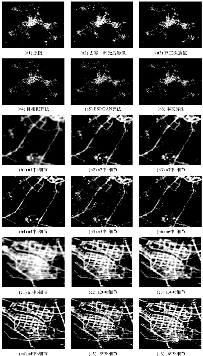 试验2是针对城区及郊区的夜光影像超分辨率重建试验。试验流程及参数设置与试验1相同。在该区域的去云雾、去辉光也取得了较好的结果,如图 20(a2)及其相应细节所示,并以此为超分辨率重建的输入影像,最后的重建结果影像如图 20所示,该区域的无云影像如图 21所示。对比观察图 20(a3)、(b3)、(c3)可以看出,插值后的影像平滑,灯光边缘模糊严重;图 20(a4)、(b4)、(c4)中的灯光边缘过平滑现象严重,地物信息产生了变形,部分点状灯光信息平滑为线状信息;图 20(a5)、(b5)、(c5)中的灯光密集区域出现假信息和噪声信息;图 20(a6)、(b6)、(c6)中的模糊云雾信息明显减少,与图 21对比可以看出,复杂城区灯光的辉光扩散效应明显减弱,灯光信息更聚拢,细节、边缘更加清晰。说明3种对比方法都没有本文方法有效。