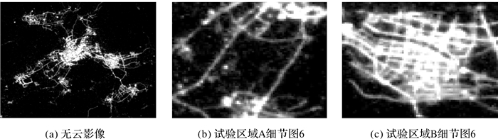 随着遥感技术的不断发展,遥感数据的种类越来越丰富。其中夜光(nighttime light, NTL)遥感卫星能够获得与人类活动有关的城市灯光、自然界物体发光、舰船灯光和油井燃烧发光等信息[1],在反映人类社会活动方面具有独特的能力,因此它被广泛应用于社会经济领域的空间数据挖掘问题中[2-4]。夜光遥感影像属于夜晚低照度拍摄环境下的成像,被拍摄场景是不均匀的亮度信息[5],成像时受环境(如大气光、云雾)、目标辐射、光学成像系统等方面的影响更为突出,往往在影像上表现出模糊、分辨率降低等综合降质现象,如图 1(c)所示。影像的模糊主要表现为由于大气散射产生的辉光模糊(图 1(a))和由云雾产生的模糊(图 1(b));影像的分辨率降低主要是受成像硬件的影响。对于这些降质问题目前通常采用各种软件处理方法进行去除或者减弱,如一般用影像复原方法去除模糊,用超分辨率重建方法提高影像的分辨率,从而达到影像质量提升的目的。