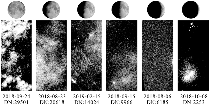 | 图 4 不同程度的云雾和月光对影像质量的影响 Fig. 4 Effects of different degrees of cloud and moonlight on image quality |