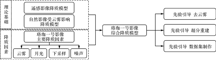 由式(7)可以看出,夜光影像的降质包括大气辉光、云雾、降采样的影响,首先,依据该退化模型,分析出夜光影像的主要降质因素;然后,根据先验知识,引导设计网络结构和制作相应的数据集,本文方法的思路如图 5所示。