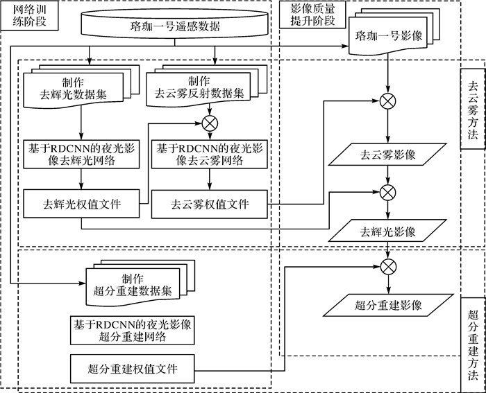本文方法的技术路线如图 6所示,整体上分为训练和质量提升两个部分。训练部分包括去辉光、去云雾和影像超分辨率重建3个部分,首先,根据降质特征制作以上3类数据集,按照8∶2的比例分配训练集和验证集。然后,设计去辉光、去云雾、超分辨率重建的深度学习网络。在训练阶段,去辉光和去云雾网络结构相同。先训练去辉光任务,在网络收敛后,利用网络的可迁移性[49],将训练好的权值作为去云雾网络的预训练参数,进一步提取云雾网络特征。在影像质量提升阶段,处理过程为先去云雾再去辉光,最后进行超分辨率重建,主要原因为:①依据退化模型表达式(7),在不考虑D(x, y)和η(x, y)的情况下,去云雾相当于去除M(1-t(x, y))、t(x, y)的影响,去辉光相当于去除h(x, y)的影响。由于云雾距离成像传感器较近,辉光的程度相对地面光源的辉光程度不同,这种差异是很难模拟的;②从影像的主要降质表现来看,云雾是主要的降质因素,但不是所有成像区域都有云雾,而辉光却是普遍存在的,若先整体去除辉光h(x, y),云雾也会被作为光源信息参与到辉光网络中,处理后必然会对云雾的纹理特征产生影响,从而导致后面的学习网络对云雾信息处理有偏差;③从模拟数据集构建角度考虑,如果先去云雾再去辉光,模拟云雾数据集需要考虑透射率t(x, y)、月光强度M及噪声,而含辉光的数据集仅需考虑h(x, y)。如果先去辉光再去云雾,构建去辉光数据集时不仅需要模拟h(x, y),还需要增加云雾反射等信息,而这两项同时考虑非常复杂,增加了构建数据集的难度;④从目前的试验来看,如果先去除辉光,网络会将云雾信息识别为光源,从而改变云雾噪声的特征,使去云雾更加困难。
