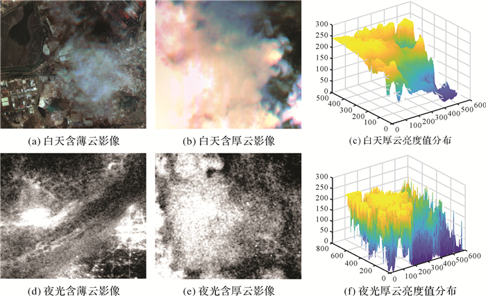 由于真实同一地区的晴天、阴天影像对数据有限,所以构建含云雾的模拟数据集B2。由于云层形状与浓度的实时变化对遥感影像造成的污染难以推演和预测,所以分析影像中云层的空间分布特性与成像特征是构建数据集的必要前提。这里对比分析了含有云雾的白天影像和夜光遥感影像的差异,并绘制其厚云雾亮度值三维曲线,如图 9所示。