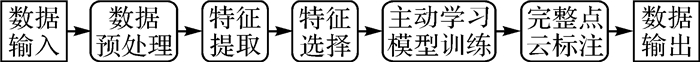 1 点云场景语义标注方法本文提出的结合排序批处理模式的主动学习点云场景语义标注方法主要包括点云数据预处理、特征提取、特征选择、主动学习模型训练和完整点云标注5部分,算法流程如图 1所示。