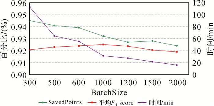 由图 10可知,随着BatchSize的增大,平均F1 score和采样时间呈下降趋势,SavedPoints先增加后减少。这是因为主动学习算法依赖于小批次的多次迭代来改善模型精度。当一次采样过多样本后反而会产生较差的结果。综合考虑采样时间、平均F1 score及SavedPoints值,本文选取BatchSize=1000作为理想批次采样点数量。