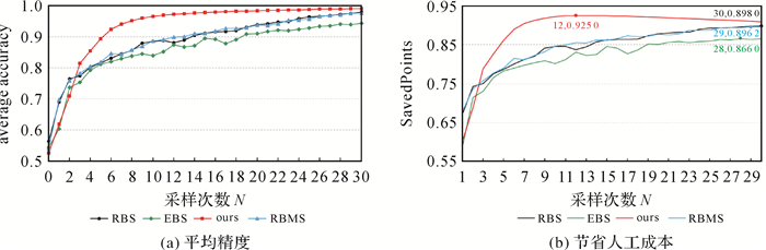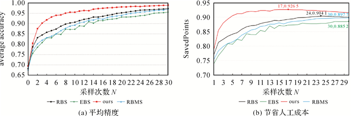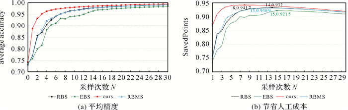 2.3 标注结果和节省人工成本对比分析为进一步分析本文算法的有效性,将本文方法与RBS[30]、EBS[36]、RBMS[31] 3种方法进行了对比分析。RBS、EBS、RBMS和本文方法的初始样本集、未标注样本集、参数设置等外在条件均相同。首先对比了4种方法在不同采样次数下的标注平均精度和节省的人工成本情况,然后对比了4种方法在相同采样次数下标注结果以及时间成本。