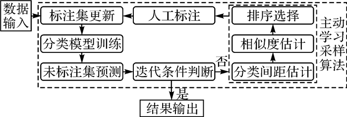 1.4 主动学习模型训练主动学习模型训练是一个多次迭代的过程。在每次迭代中,由更新后的标注集对主动学习分类模型进行训练,利用分类模型对未标注集进行预测,根据预测结果和主动学习采样算法来选取一批有价值的样本交由人工标注,将人工标注好的样本加入标注集更新模型并开始下一次迭代,直到满足迭代停止条件为止,其整个流程如图 2所示。