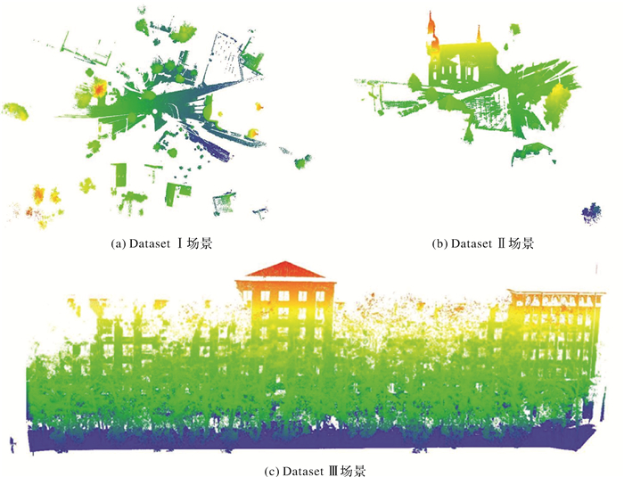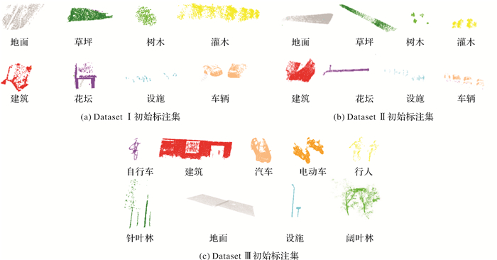 2 试验与分析 2.1 试验设置与评价指标为了验证本文方法的有效性,在3个不同的大规模室外场景点云上进行了试验验证。前两个场景Dataset Ⅰ、Dataset Ⅱ来自著名的Semantic 3D激光点云公开基准数据集[35];第3个场景Dataset Ⅲ来自由FARO三维激光雷达扫描仪在武汉大学校园内自采集的数据集,如图 3所示。这3个场景都存在数据集不均衡问题,例如Dataset Ⅰ、Dataset Ⅱ设施和车辆类的数量要远远小于其他类的数量,Dataset Ⅲ自行车、电动车、设施和行人4类之和不足所有类的1%。除了数据集不均衡问题外,还存在着同类变异、类间相似、相互遮挡、扫描不全等多种挑战。