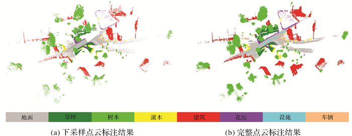 为分析下采样处理对语义标注结果的影响,本节分别用直接对完整点云进行标注和先下采样后标签传播两种处理模式对Dataset Ⅲ场景进行标注,其中完整点云的采样点数量BatchSize=5800,其他条件设置与下采样点云一致,具体结果见表 3。