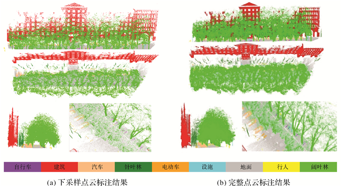 对于没有下采样的点云,只需用主动学习训练模型对未标注样本集进行预测,然后人工修正小部分标注错误的点云即可完成语义标注;而对于下采样过的点云,首先利用主动学习训练模型完成初步标注,人工修正小部分错误点,然后利用邻域等权标签传播[34]算法标注完整点云。该算法的基本思想是距离越近的点越可能具有相同的语义标签,即原始点云中的每个点的标签与该点在下采样点云中最近点的标签相同。