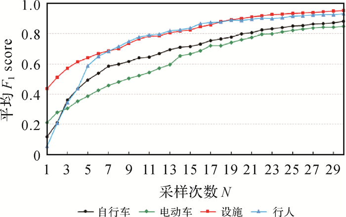 由表 2可以看出,Dataset Ⅲ自行车、电动车、设施和行人类错分点数量少但所占比例高;建筑和阔叶林类所占比例低但错分点数量多。对于这一现象,一方面是由于数据集的极度不平衡导致的,自行车、电动车、设施和行人4类之和不足所有类的1%,加之本文算法在采样次数较少时更为关注数量较多的类以快速提高精度,从而导致数量较少的类标注结果变差,对于这一问题可以通过适当增加采样次数来解决。图 8给出了每次采样后Dataset Ⅲ少数类的平均F1 score变化情况。如图 8所示,随着采样次数的增加,Dataset Ⅲ少数类的平均F1 score也逐渐增加,即少数类的标注结果在逐渐变好。