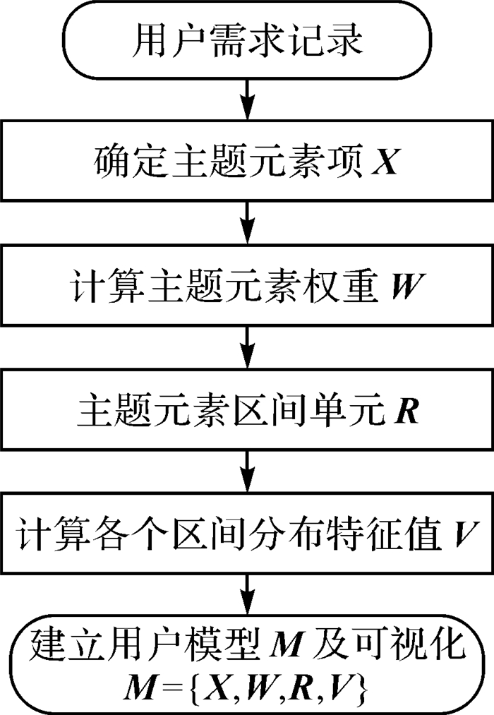 式中,X={x1, x2, x3, x4, x5},xi为主题元素项;W={w1, w2, w3, w4, w5},wi为主题元素xi权重值;R={r1, r2, r3, r4, r5},描述各元素分布值域和区间长度;V={v1, v2, v3, v4, v5},vi为元素xi分布特征。流程如图 1所示。