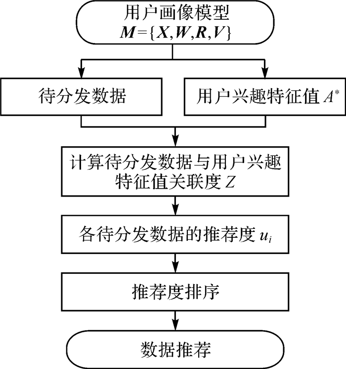 2 主动推荐解算 2.1 解算流程基于用户画像模型,对待分发数据进行推荐度解算,最终将推荐度高的数据推送给用户。流程主要包括理想解确定、兴趣关联度计算、推荐度求解及推荐度排序等环节(图 2)。