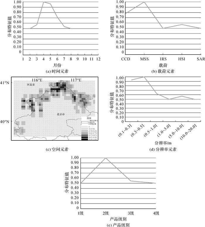 主题元素一般是基于用户需求订单或检索记录对用户关心的核心元素项进行抽取,不同用户一般具有不同的主题元素项,且元素个数可扩展。这里主要选取各类遥感用户关注相对较多的5个常规遥感产品共性元素:拍摄时间x1、空间范围x2、载荷x3、分辨率x4及产品级别x5。