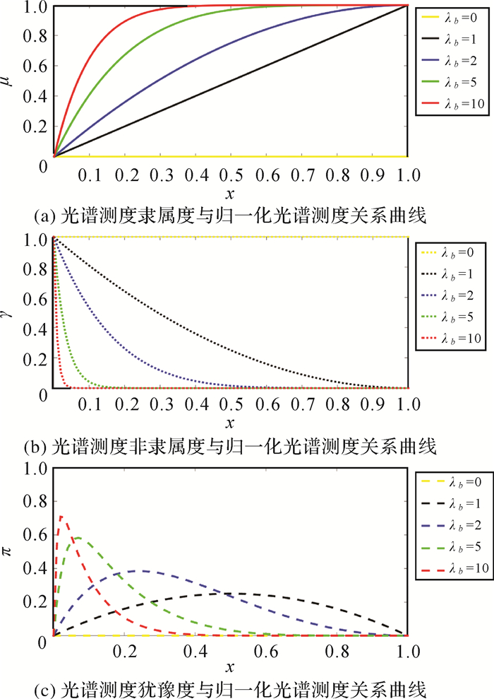 对于给定影像X,通过改变波段指数λb可以得到不同的光谱测度隶属度、非隶属度和犹豫度值,从而生成不同的直觉模糊集。当λb取不同值时,光谱测度隶属度、非隶属度和犹豫度随归一化光谱测度xib的变化规律如图 1所示。