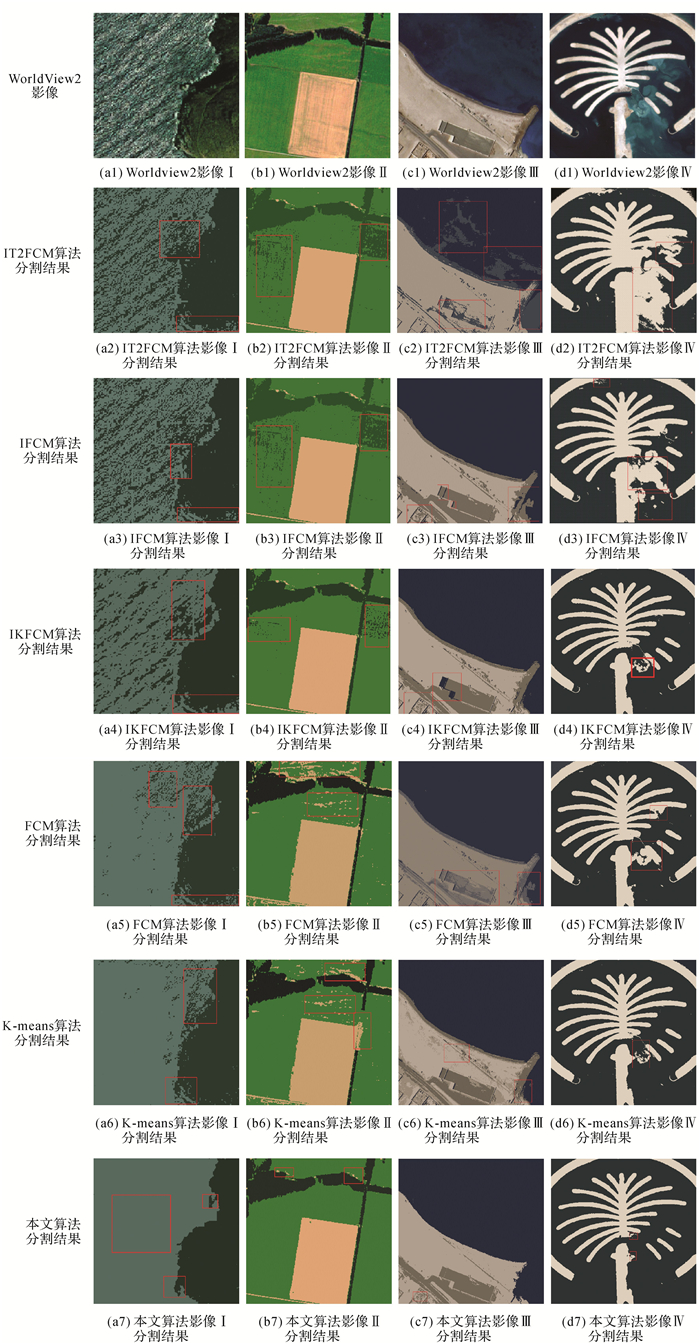 为了证明本文算法在遥感影像分割上的可行性和优越性,选取了多幅彩色遥感影像进行了分割试验。以图 10(a1)—(d1)所示WorldView2遥感影像为试验影像,包含河流、建筑、海岸、水体、裸地、林地和草地等地物类别,影像尺度均为256×256像素,波段数为3,空间分辨率为0.5 m。分别采用本文算法、IT2FCM、IFCM、IKFCM-L、FCM和K-means算法对试验影像进行分割。