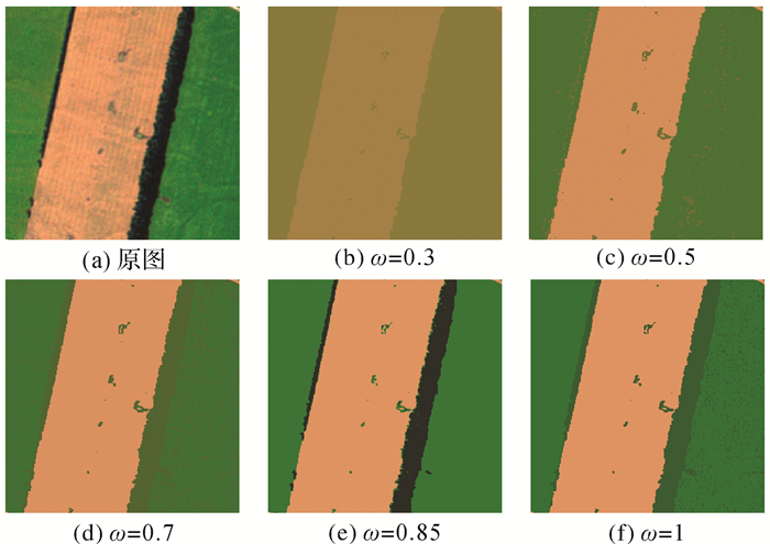 由于式(10)中像素类属非隶属度由Yager算子生成,因此Yager算子中参数的选择会影响聚类结果。为了得到最优聚类结果,需先选取ω的最优值。在式(10)中,ω的取值范围为(0, 1],当ω取值趋近于0时,像素类属非隶属度值为零,难以体现像素的非隶属性;当ω取值为1时,像素类属犹豫度为零,则无法描述聚类中“非此非彼”的模糊性。为了讨论ω性能,分析了ω在不同取值时像素类属非隶属度、犹豫度关于隶属度的曲线,据此选取最优参数,并通过试验对其进行了验证。图 4(a)、(b)分别为不同参数下像素类属非隶属度和犹豫度关于隶属度的曲线,由图 4(a)、(b)可以看出,当0 < ω≤0.5时,像素类属非隶属度和犹豫度值波动极大且分布不均匀,并不符合聚类过程中的实际变化规律;当0.5 < ω < 1时,像素类属非隶属度和犹豫度值随隶属度变化稳定且分布均匀。其中,当ω取值为0.85时,像素类属犹豫度较小且分布均匀,最能描述聚类中“非此非彼”的模糊性,是最优的参数值。基于此,本文ω取值为0.85。