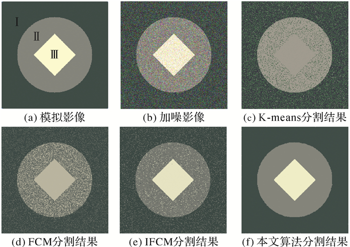 3.1 模拟影像分割试验为了验证本文算法的抗噪性,在大小为256× 256像素,波段数为3,包括3个同质区域(图 6(a)中标示的区域Ⅰ—区域Ⅲ)的彩色模拟影像上添加均值为0,标准差为0.02的高斯噪声,图 6(a)、(b)所示分别为模拟影像和及其加噪影像。采用K-means、FCM、IFCM和本文算法对加噪模拟影像进行分割。图 6(c)—(f)分别为K-means、FCM、IFCM和本文算法对模拟影像的分割结果。