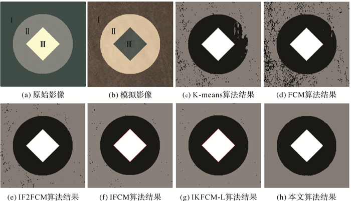 3 试验结果与讨论为了验证本文算法的可行性且相比于同类算法能够更好地处理模糊信息,分别对模拟影像和彩色遥感影像进行了分割试验,并与未考虑类属模糊信息的经典硬聚类算法K-means算法[25],仅考虑像素类属隶属度的FCM算法,文献[13]提出的IT2FCM算法、文献[14]提出的考虑像素类属隶属度与犹豫度的IFCM算法以及文献[15]提出的考虑光谱不确定性的IKFCM-L算法进行对比试验。