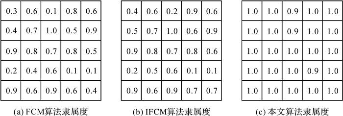 3.2 消除不确定性效果验证为了验证本文算法在引入直觉模糊集后对类属模糊信息的处理能力,在添加了高斯噪声的模拟影像(图 8(a))中提取大小为5×5像素的窗口,其放大效果如图 8(b)所示,可以看出该区域内含有部分噪声。图 9(a)—(c)分别为FCM、IFCM和本文算法对窗口区域分割结果的隶属度值,1表示像素属于该类别,0表示像素不属于该类别,隶属度值越大则表示像素属于该类别的程度越高。如图 9所示,FCM算法对噪声敏感,在噪声点隶属度值普遍较低,类属不确定性极大;而IFCM算法则在FCM算法的基础上有所改进,对于部分噪声点,其隶属度得到一定改善,但像素类属仍旧存在不确定性;本文算法经过对影像光谱及聚类过程中不确定性的改善,提高了算法对模糊信息的处理能力,使得像素隶属度趋近于0和1,最大限度地降低了聚类的不确定性,提高了分割精度。