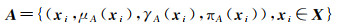 式中,μA(xi)(∈[0, 1])和γA(xi)(∈[0, 1]) 分别为xi对X的隶属度和非隶属度,且满足0 < μA(xi) < γA(xi) < 1;πA(xi)=1-μA(xi)-γA(xi)为X中元素xi的直觉指数,表示该元素对于集合X的犹豫度。