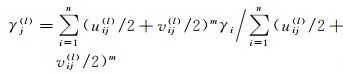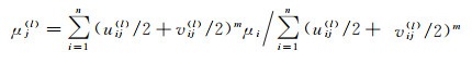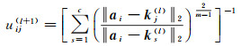 为了得到目标函数的最优解,依据拉格朗日定理构建关于该目标函数中变量的拉格朗日方程。求取拉格朗日方程对像素类属隶属度、非隶属度和聚类中心的偏导数,并使其为零,设l为迭代指数,则可以求得聚类中心集合K(l)={ kj(l), j=1, 2, …, c},kj(l)=(μj(l), γj(l), πj(l)),其中μj(l)、γj(l)和πj(l)分别为