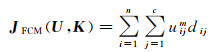 1.2 FCM聚类对于待分类数据集X,FCM算法利用元素xi对类簇j的类属隶属度,以及与代表类簇j的聚类中心的距离测度构建目标函数,并通过最小化该目标函数获得各元素的最优类属隶属度,从而得到最终的分类结果。FCM算法的目标函数为