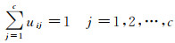 式中,U =[uij]n×c为像素类属隶属度矩阵;c为聚类数;j为类别索引;K是聚类中心矩阵,即K =(kj, j=1, 2, …, c);m为表示算法模糊程度的模糊因子;dij=‖ xi- kj‖2,即元素i到聚类中心j的欧氏距离,uij(∈[0, 1])为元素i对聚类j的像素类属隶属度,且满足条件