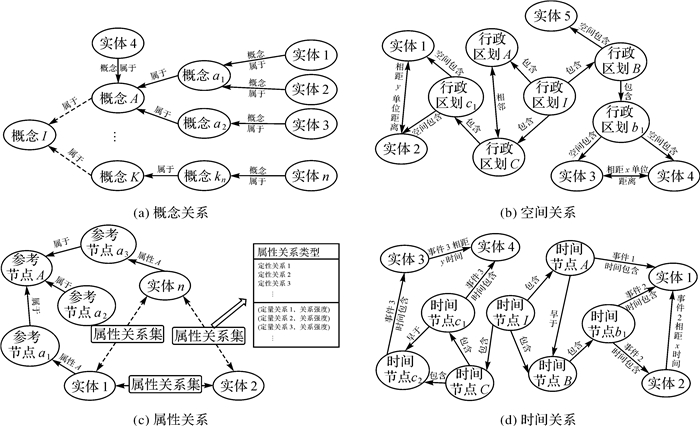 式中,Ei、Ej表示不同的地理实体;Y为引入的外部参考知识节点集;Rax为地理实体之间定性属性关系集;Ral为定量属性关系集;Raw为地理实体与外部参考知识节点之间的关系集。在构建属性关系时并非所有的属性都建立关联,要考虑属性建立关联后的意义与价值。模型如图 2(c)所示。