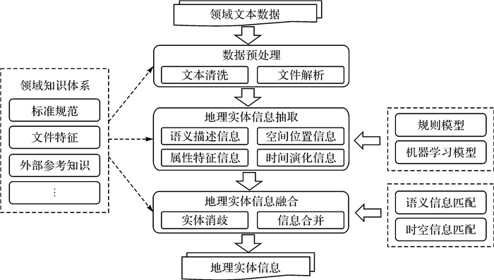 2.1 地理实体信息抽取从自然语言描述的领域文本中识别目标地理实体,发现并抽取与地理实体相关的类别、时空、属性等信息,是面向领域文本的地理实体信息抽取的主要任务。自然资源管理领域文本数据具有不同卷宗相对独立、涵盖内容丰富、文件类型多样、文本结构清晰稳定、信息描述无歧义等特点,通过梳理与构建有关标准规范等领域知识参考体系,本文设计的地理实体信息抽取流程如图 3所示。