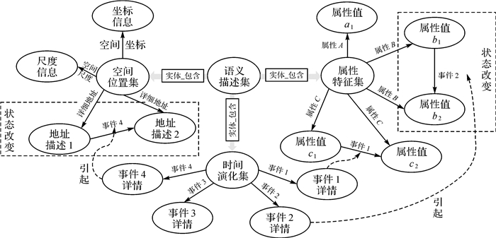 2.2 地理实体信息存储基于Neo4j图数据库,本文设计的存储方案为:首先,针对抽取得到的地理实体信息,按照特征表达的4个维度分类进行组织和存储。语义描述集是一级节点、以键值对的形式存储语义描述信息。空间位置集、属性特征集、时间演化集是二级节点,挂接在语义描述节点上,域内各数据项以3级及更高层次节点的形式进行存储。其次,针对地理实体的状态变化信息,通过建立对应节点和关系进行表达。在存储时,先对时间演化维度内的所有事件内容进行检索,如果存在引发实体状态改变的事件,获取事件发生及相应状态变化信息;然后针对改变的特征字段,依据变化类型,建立新的节点和关系。例如实体的“属性B”在“事件2”的影响下发生了改变,则建立新节点“属性值b2”存储更新后的值,同时建立属性特征集节点到新属性值节点的关系“属性B”, 以及旧属性值节点到新属性值节点间的关系“事件2”(只记录事件名称,不记录内容)。存储方案示例如图 4所示。