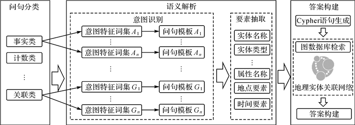 3 基于实体关联网络的知识问答为体现与验证地理实体关联网络的应用能力,本文以知识问答为案例,设计了基于地理实体关联网络的问答算法。知识问答算法的关键在于对问句搜索语义的解析,以及基于实体关联网络的语义信息检索。本文算法流程如图 5所示,具体为:①基于支持向量机的问句分类;②基于模板匹配的问句语义解析,包括意图识别与要素抽取两个步骤;③基于实体关联网络的自然语言答案构建。