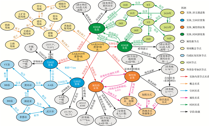 建立能够有效支撑领域知识服务的地理知识表示方法,是开展知识管理与应用的重要基础。知识图谱技术为发展地理智能服务提供了知识表示、推理与应用的有效手段[11-12]。文献[13]以知识图谱的形式融合地理空间和百度百科数据,并基于此表示地理对象的静态时空信息,对地理数据到地理知识的拓展具有重要参考价值,但未考虑时空演变等动态知识。文献[14]围绕地理实体的状态和变化等核心元素提出了图结构的地理知识形式化表示方法,能够实现地理实体演化过程的有效表征,但对实体关系的建模较简单。现有知识图谱表示方法大多存在对时空维度的建模不够、实体关系表达有限等问题[15-16],如何在网络中有机植入时空维度、实现地理知识充分关联,是开展基于知识图谱的地理知识服务的关键[2, 17]。在自然资源管理领域,借鉴知识图谱技术,设计图结构的地理知识表示方法,构建多维度的地理实体关联网络,继而支撑领域知识检索、问答、推荐等服务,是一种可行的方案。
