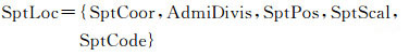 式中,SptCoor为空间坐标,以坐标点或坐标范围的形式表示地理实体的中心点位置或区域范围;AdmiDivis为行政区划,指能够完全包括该地理实体的最小外包行政区划;SptPos为空间定位,即详细地址,是对地理实体位置信息的文字化描述,可精确到村或社区级;SptScal为空间尺度,反映出地理实体的空间跨度,若某地理实体在空间上跨越多个同级行政区划,则其空间尺度为上级区划等级;SptCode为行政编码,是行政区划信息的标准化表达。