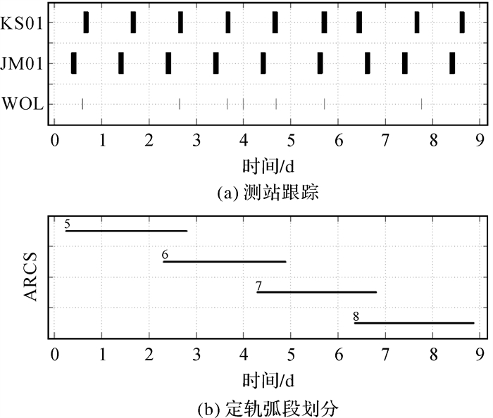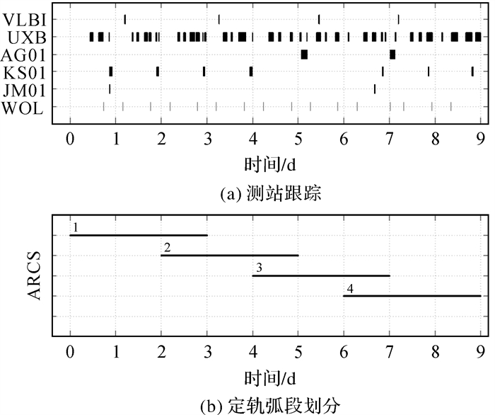 | 图 2 第1段数据测站跟踪情况和定轨弧段划分 Fig. 2 Tracking data coverage by station and arc segment division in the first section |