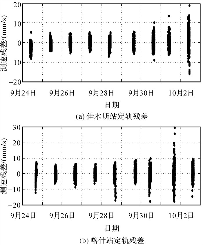 2.4 单向多普勒定轨精度评估 2.4.1 单向多普勒定轨残差本文使用2.1节建立的模型和表 1中的定轨解算参数对两段单向多普勒数据进行定轨计算,两段数据的定轨残差分别如图 4、图 5所示,残差统计结果见表 3。