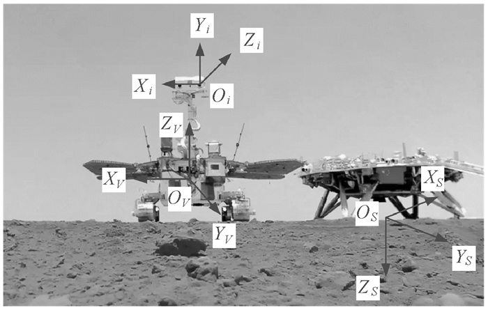 1 基于联合平差的自检校方法 1.1 坐标系定义建模过程涉及的坐标系定义如图 2所示。图像坐标系o-xy:原点o位于图像中心,x轴沿图像行指向右,y轴沿图像列指向上。导航相机i(i代表A或B)坐标系Oi-XiYiZi(i坐标系):原点Oi位于相机投影中心,Xi轴指向右、Yi轴指向上、Zi轴沿主光轴指向后。火星车本体坐标系OV-XVYVZV(V坐标系):原点OV位于火星车结构底板几何中心,XV轴指向右、YV轴指向前进方向、ZV轴沿铅垂线指向上。着陆点坐标系OS-XSYSZS(S坐标系):原点OS位于着陆点,XS轴指向北、YS轴指向东、ZS轴沿铅垂线指向地。