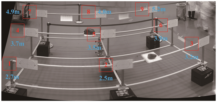 验证1:在文昌航天发射场开展了导航相机A、B引导的激光诱导击穿光谱(laser induced breakdown spectroscopy, LIBS)联合试验。LIBS是将高能量的激光脉冲聚焦于探测目标上,通过对样品烧蚀,瞬间气化,产生高能量、高温度、高密度的等离子体;同时采集等离子体演化过程中所辐射的光谱,依据辐射元素的特征谱线位置和强度等信息进行定性和定量分析,进而确定物质元素的组成及含量[28]。联合试验时,布设了一种检核场景(图 6),该场景由9个检核点组成,用于验证自检校参数的精度。图 6中,红色线框及数值代表检核点号;蓝色数值标明的是该点到火星车的距离,单位为m。使用本文方法估计出的导航相机A、B几何参数估计出检核点在V坐标系下的三维坐标。利用经纬仪测量出检核点在V坐标系下的三维坐标。将检核点的视觉估计坐标与测量坐标进行对比,结果见表 2。